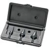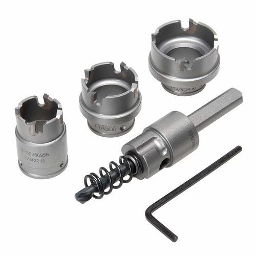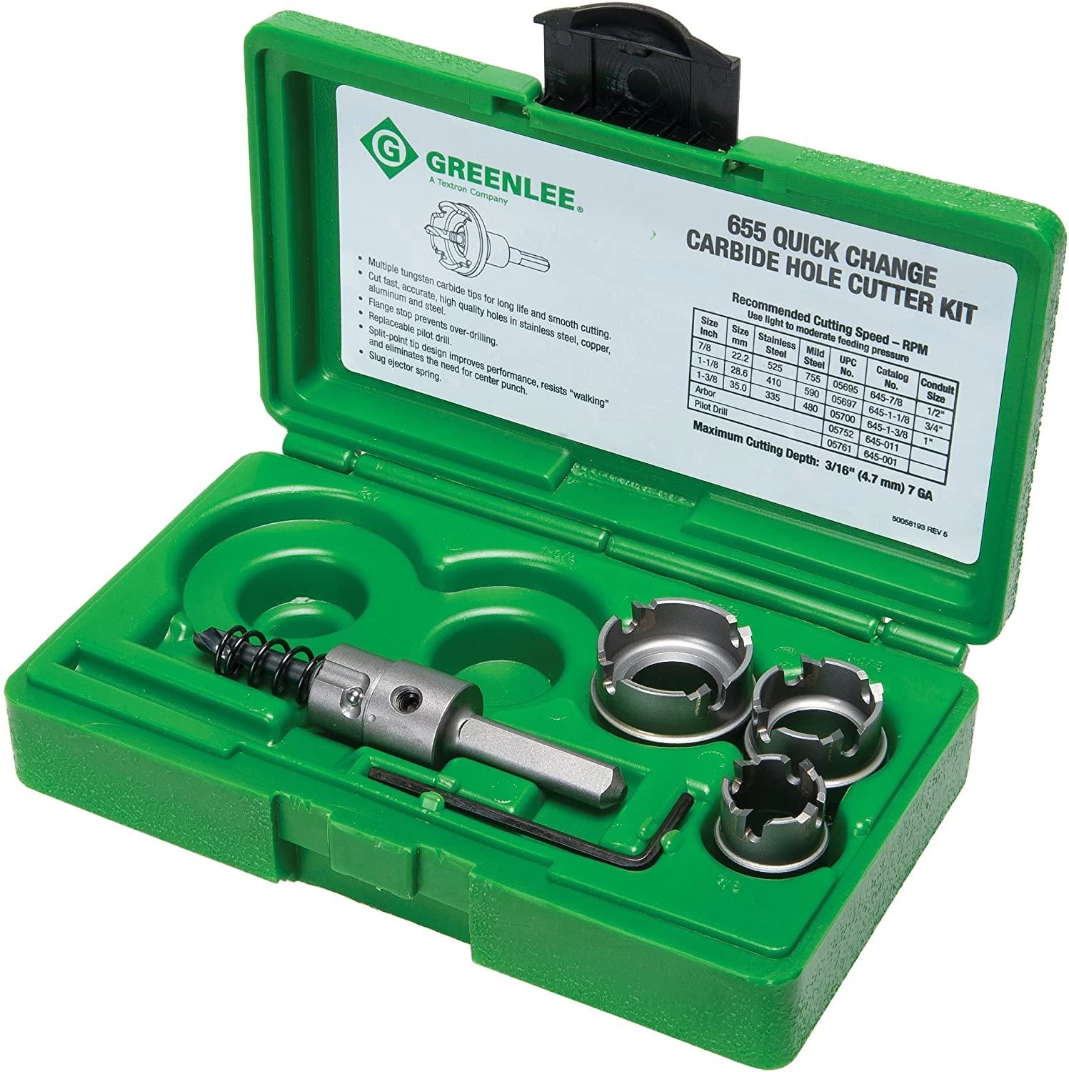 Greenlee’s stainless steel hole cutter set cuts stainless steel quickly and easily. Kwik change arbor allows you to change cutter heads with a simple push and a turn. Use the same arbor for different size cutting heads. Removable cutter heads included 7/8-Inch , 1-1/8-Inch and 1-3/8-Inch . Minimum chuck size of 3/8-Inch .
