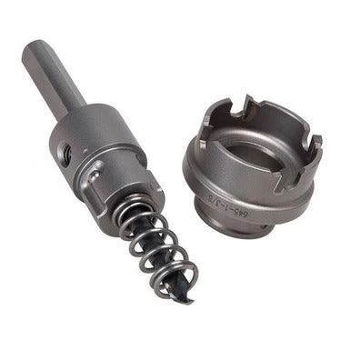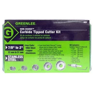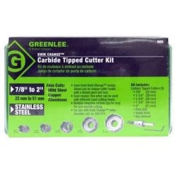 Greenlee’s stainless steel hole cutter set cuts stainless steel quickly and easily. Kwik Change arbor allows you to change cutter heads with a simple push and a turn. Use the same arbor for different size cutting heads. Quick change stainless steel hole cutter kit 7/8-Inch , 1-1/8-Inch , 1-3/8-Inch , 1-3/4-Inch and 2-Inch .