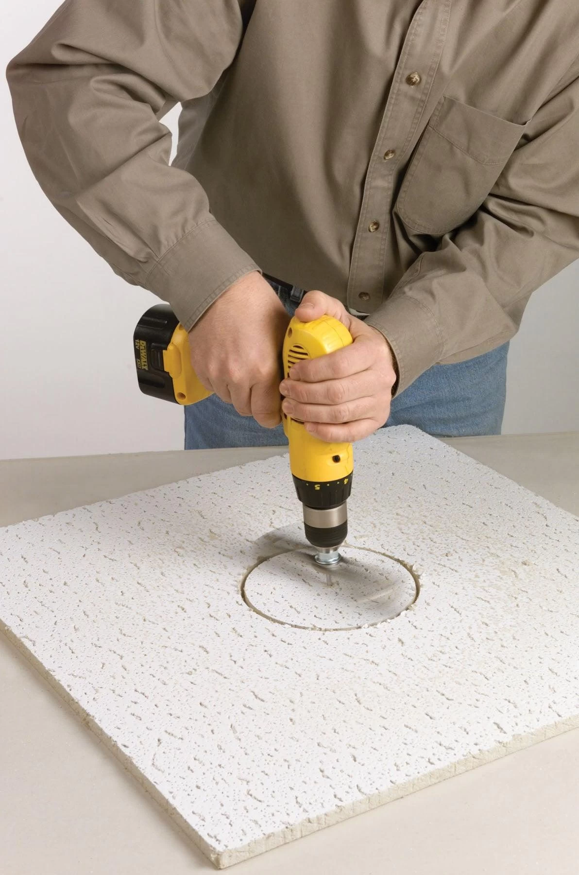 Ideal Adjustable pot-light hole saw can be adjusted to 10 different sizes, from 2-1/2 to 7 inch. It cuts through drywall and ceiling tile only. It is made of self-sharpening carbide-coated cutting blades. Comes with two dust shields to minimize clean up.