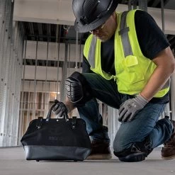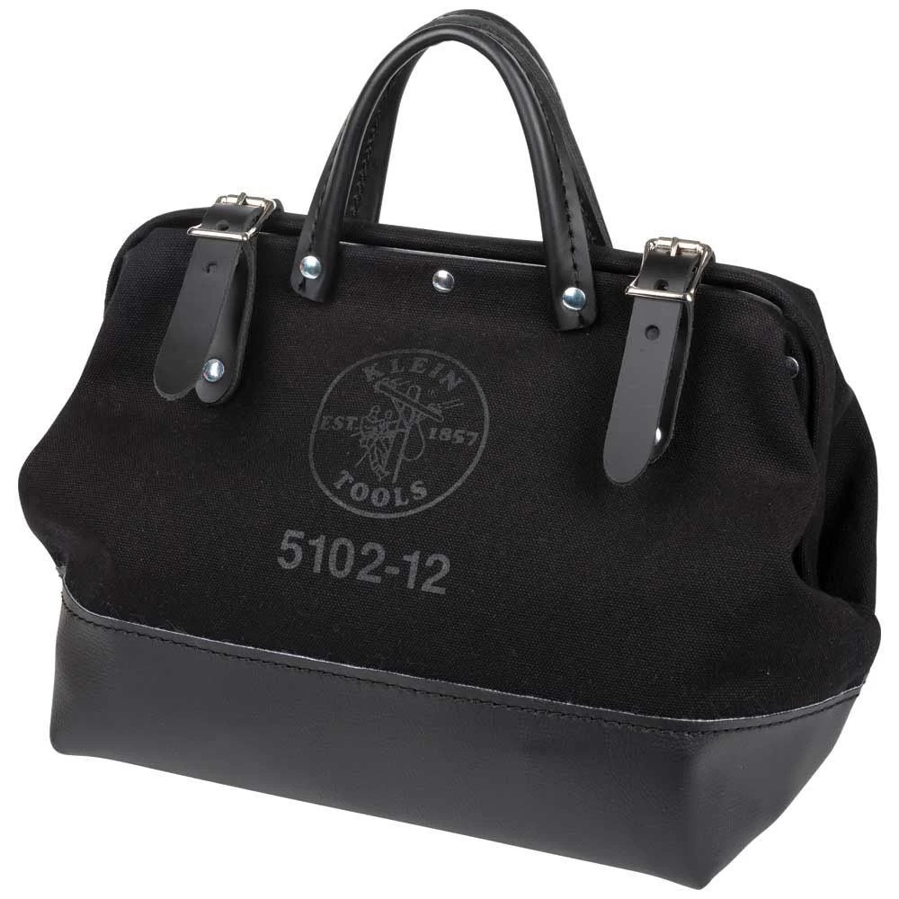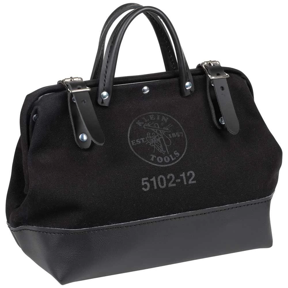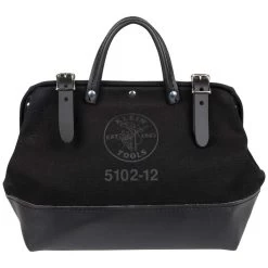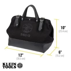 The Klein Tools Canvas Tool Bag is constructed in all black for a classic look. The 12-Inch (30.5 cm) bag is built of heavy-duty No. 8 black canvas. Features two retaining straps with buckles for a secure closure plus stitched and riveted leather handles for comfort and strength. The bag’s vinyl bottom and lower sides offer extra support and moisture resistance, while the non-scratch studs on the base protect against wear. The bag’s seams are reinforced with rivets for added durability.