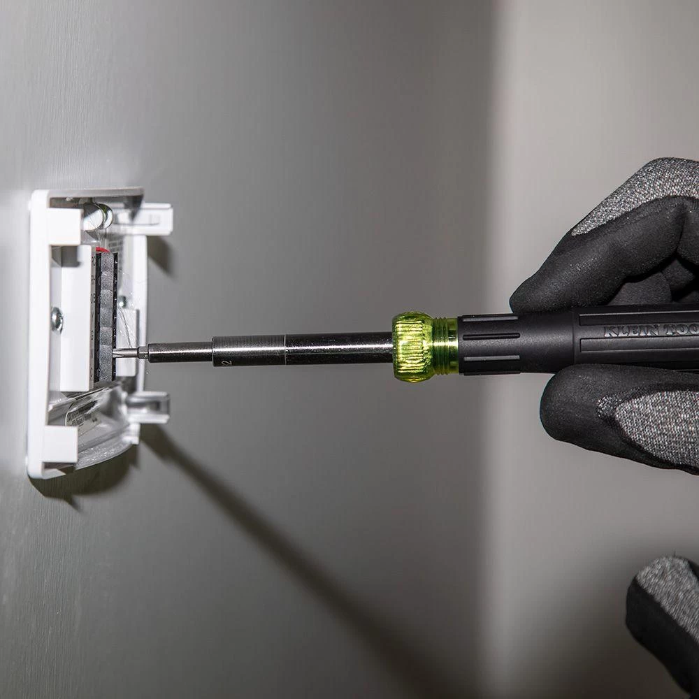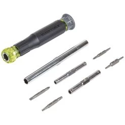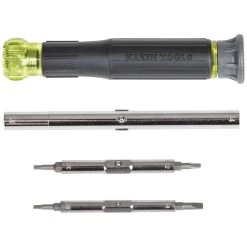 Klein Tools’ 14-in-1 Precision Screwdriver / Nut Driver features 14 of the most common precision sizes in one tool. The Cushion-Grip handle and spin cap provide outstanding comfort and control. This smartly designed tool contains 6 sizes of integrated steel nut driver shafts that securely hold four double-ended screwdriver bits. Carefully heat-treated for industrial strength, the precision-milled bits include multiple sizes of slotted, Phillips and Tamperproof TORX® bits.