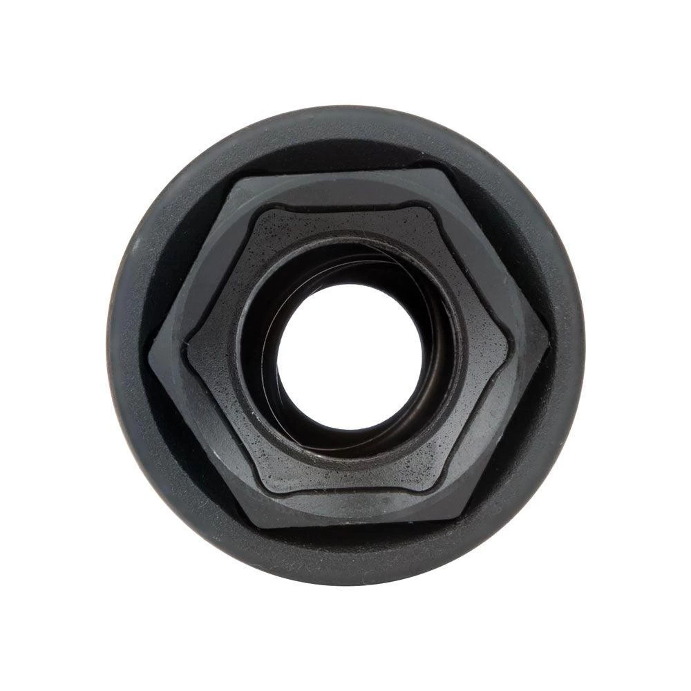 Single-ended impact socket with hands-free adjustment between 1-Inch and 13/16-Inch hex sizes. Deep socket with a 1/2-Inch drive is great for use in electrical and construction work. The high-torque, 6-Point design is easier to position and works with square fasteners.