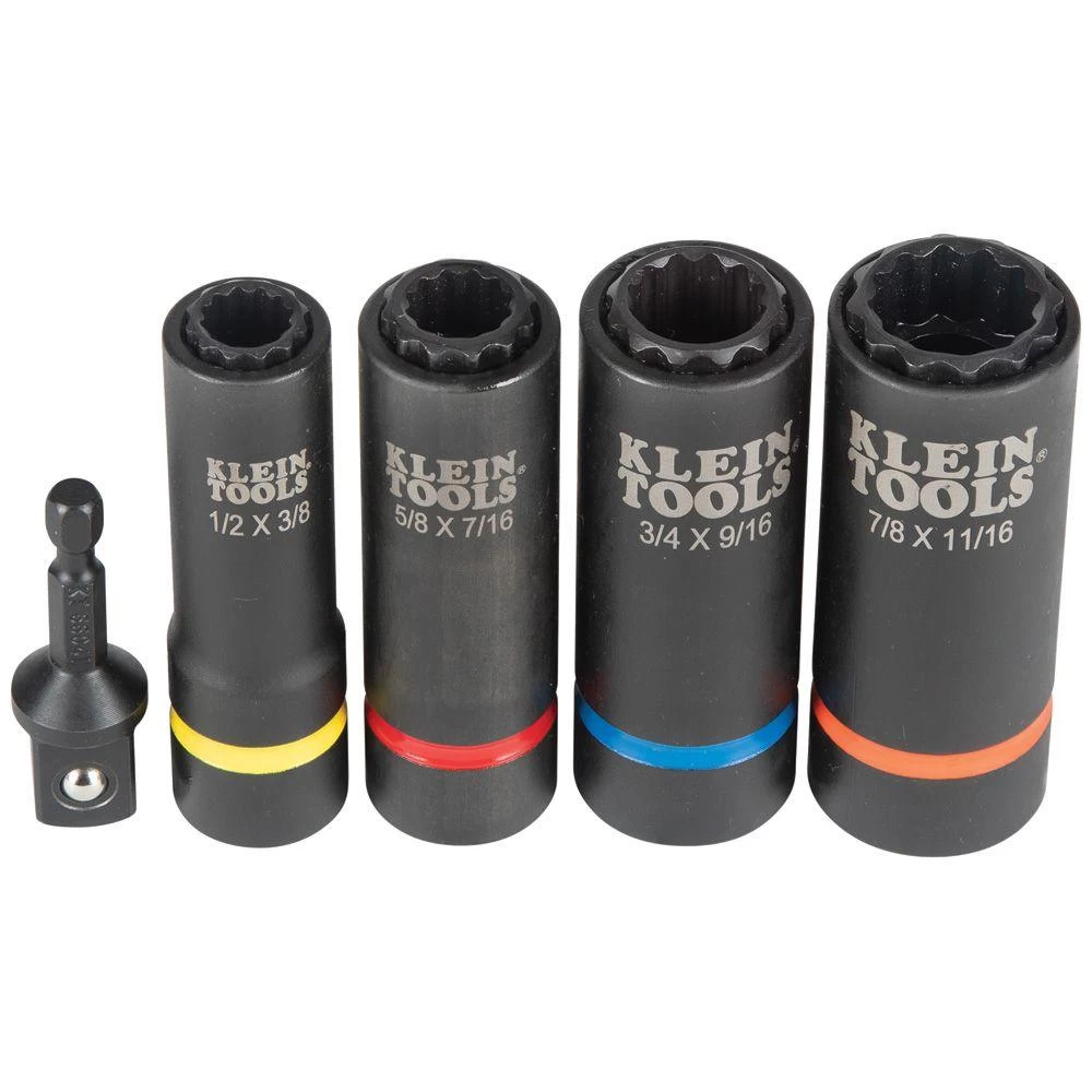 This 5-Piece impact socket set features 8 sizes in 4 easy-to-carry sockets, and consists of the most commonly used impact socket sizes used in electrical and construction work. Each impact socket features two coaxial spring-loaded sockets in one. The high-torque, 12-point design is easier to position on fasteners including square ones. Includes a 1/4-Inch hex by 1/2-Inch adapter and convenient carrying case.
