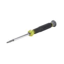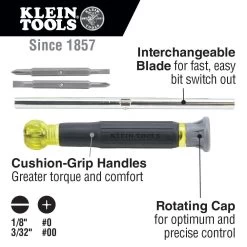Designed for precision work, Klein Tools’ electronics screwdrivers feature a swivel cap for optimum control. Made of the highest quality tempered steel, carefully heat-treated for maximum strength, and precision milled to fit screw openings securely. Rotating caps and Klein Tools’ exclusive Cushion-Grip handles offer outstanding comfort and control. Its corrosion-resistant chrome-plated barrel includes two double-ended bits that exceed ANSI standards.