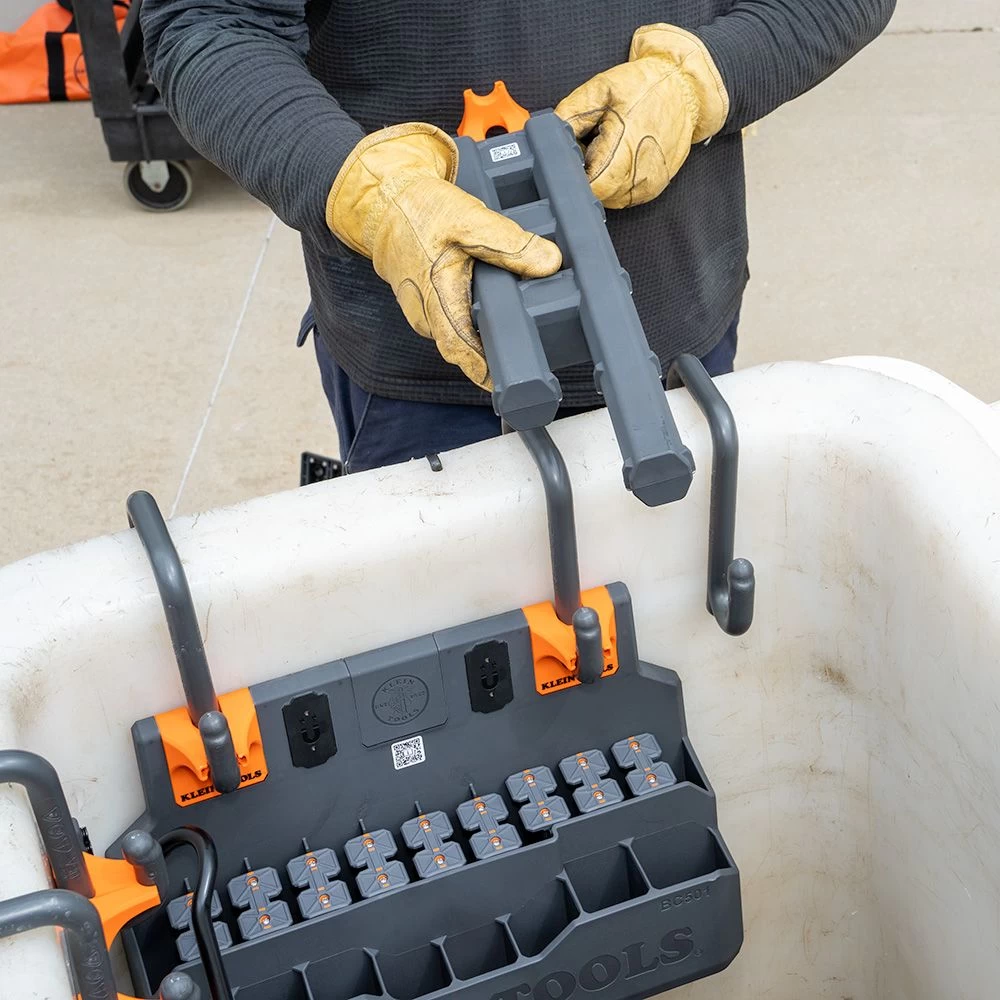 The Bucket Work Center is an ecosystem that will revamp the way a Lineman works. It allows Lineman to customize their workspace, just like other professionals customize their office space. Klein Tools’ Auger Bit Storage Module has 2 slots that fit 12-Inch, 18-Inch and 24-Inch bits. This will be ”the Lineman’s office”. The S-Hook System easily attaches to aerial buckets with a standard 2-Inch or 3-Inch (5.1 or 7.6 cm) bucket lip. An assortment of modules are available to customize each workstation to fit the tools needed for the job.