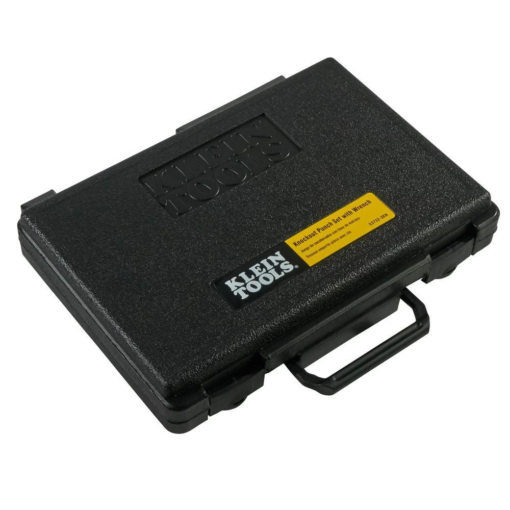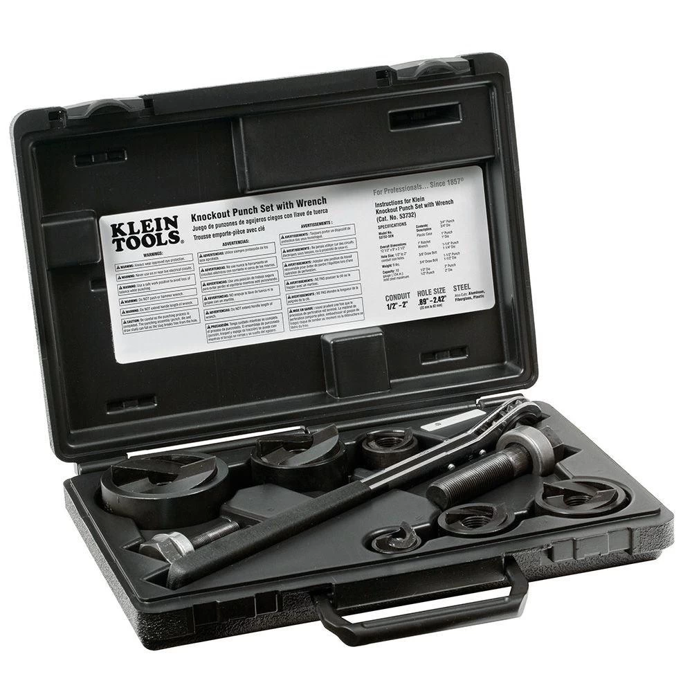 The Klein Knockout Punch Set comes with everything you need to make holes for conduit. The kit punches holes cleanly and accurately with a cutting capacity of 10 gauge mild steel, aluminum, fiberglass and plastic. It also splits slugs for easy removal.