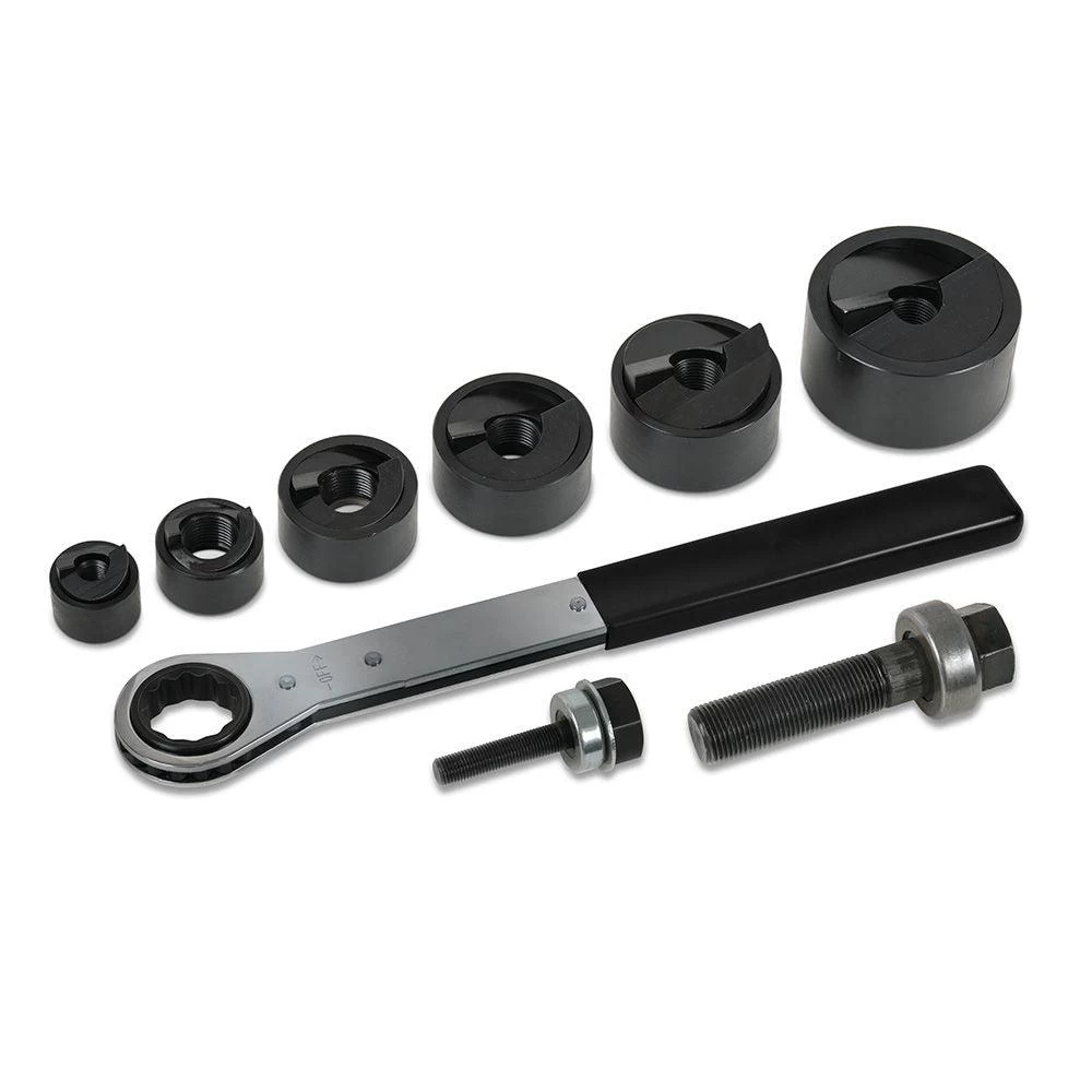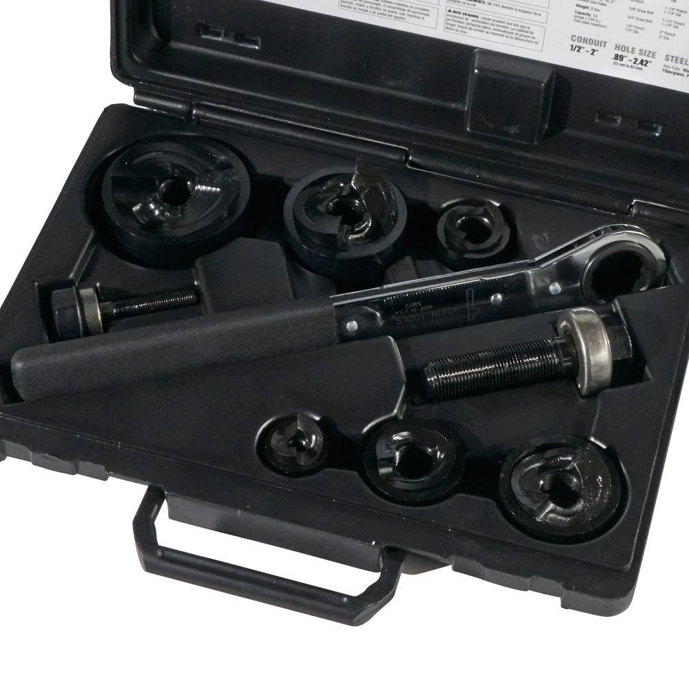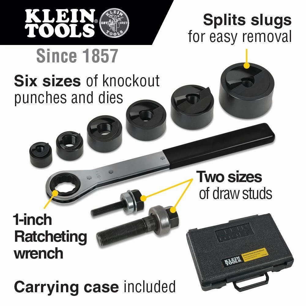 - Kit includes six different size knockout punches and dies, two draw studs and ratcheting box end wrench