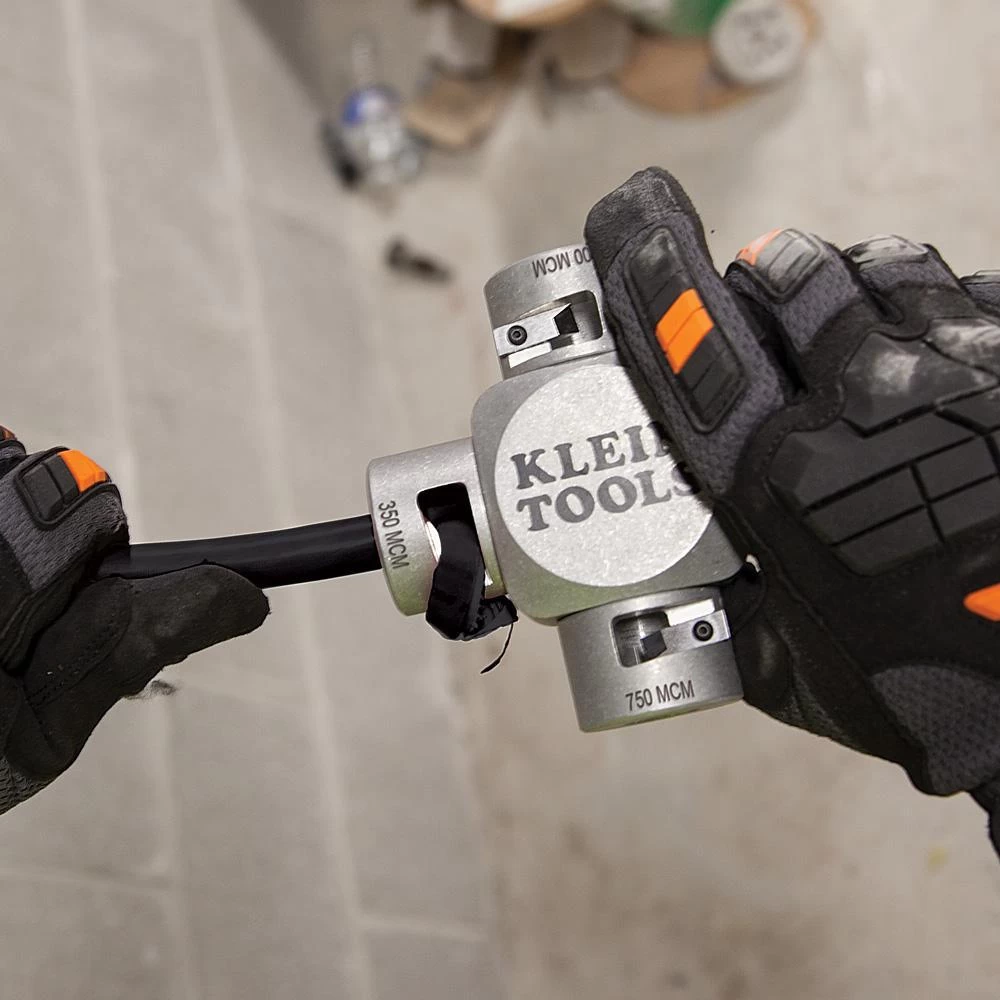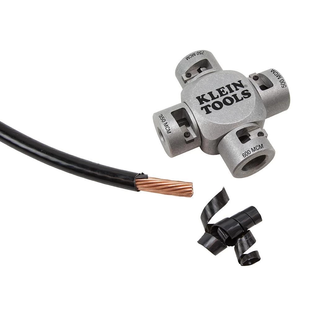 A quick and effective tool to cleanly remove the insulation on MTW/THHN/THWN-2 cable without nicking the wire. The Clover design features four different sizes (350, 500, 600 and 750 MCM) in one tool. Simply insert the cable and twist for precise, clean cuts. Stripping cables has never been easier and safer.