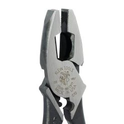 These Klein Tools Lineman’s Pliers are induction hardened and have a hot-riveted joint for smooth and powerful action without handle wobble. Their unique tempered handle design, with dual material Journeyman handles, provide a better grip and absorbs the “snap” when cutting wire, screws, nails or ACSR. These side-cutting pliers also have cross-hatched knurled jaws, and built-in channels for pulling fish tapes without damage.