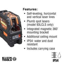 The Klein Tools Self-Leveling Cross-Line Laser Level with Plumb Spot, is a high-performance laser leveling and alignment tool for professionals. This level provides an accurate and reliable pendulum self-leveling system with clear visible laser level lines and a 90-degree vertical plumb spot feature. Equipped with an integrated magnetic mount and an additional versatile ceiling clip mount, Klein’s cross-line level enables a multitude of alignment and layout applications.