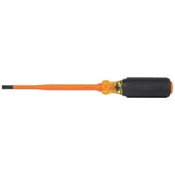Klein Tools’ Slim-Tip Insulated Screwdrivers have slim profile tips that allow for greater access into terminal blocks, slim-style breakers, or other tight spaces near energized sources. A bright orange coating of insulation protects from electrical shock, is flame and impact resistant, and sits flush with the tip helping to reduce insulation chipping and cracking. Klein insulated tools exceed the ASTM F1505 standards for insulated tools, and are clearly marked with the official 1000V rating symbol. A must-have for any electrician’s tool bag, these screwdrivers are available in 4-Inch and 6-Inch lengths with a variety of tips.