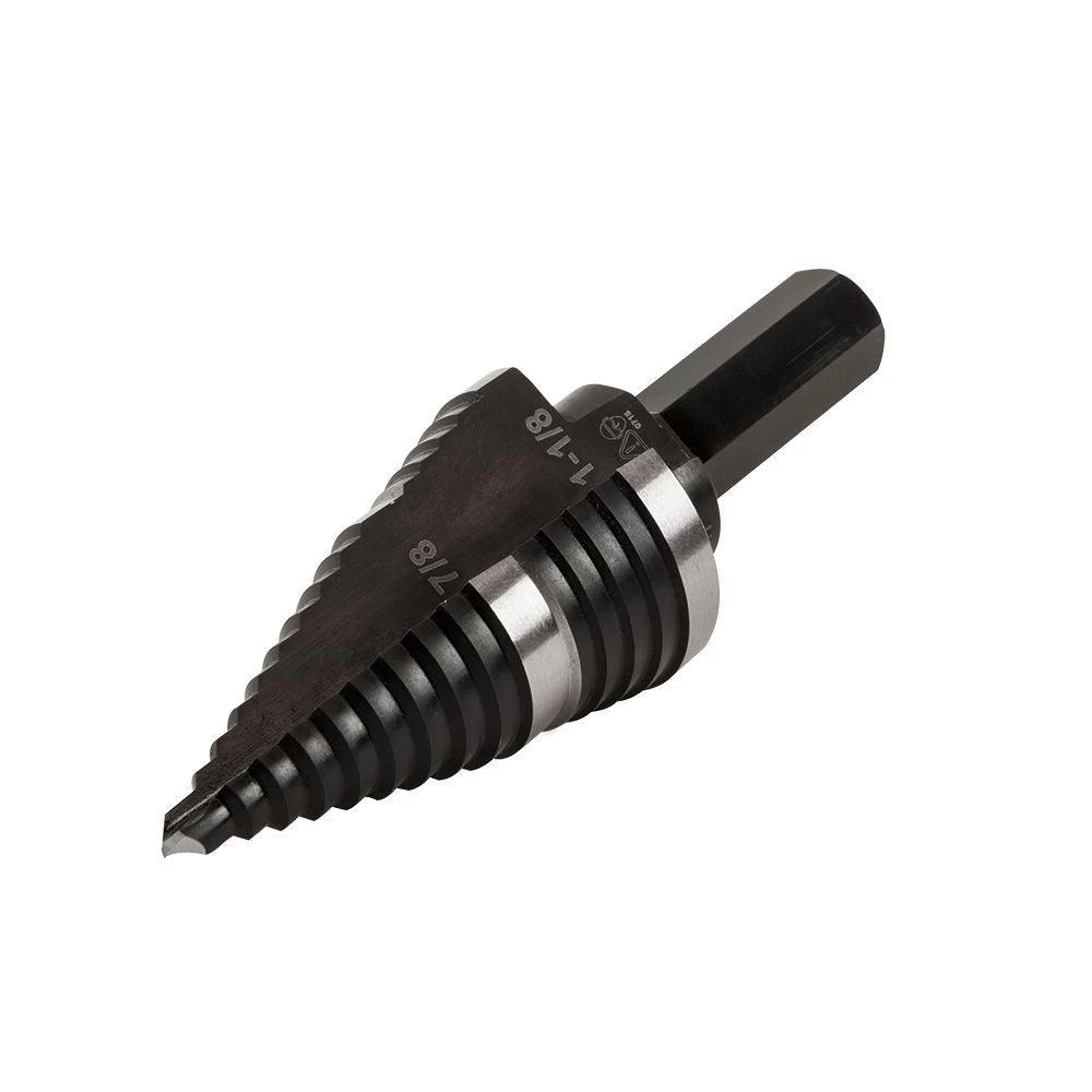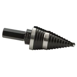 These Double-Fluted Step Drill Bits provide faster cutting and drilling than single flute bits. The easy-to-read step markings and targets save time when drilling holes. Thick 3/8-Inch hex shank provides a firm, positive grip and won’t spin out in the drill.