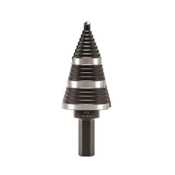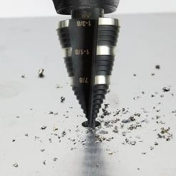 These Double-Fluted Step Drill Bits provide faster cutting and drilling than single flute bits. The easy-to-read step markings and targets save time when drilling holes. Thick 3/8-Inch hex shank provides a firm, positive grip and won’t spin out in the drill.