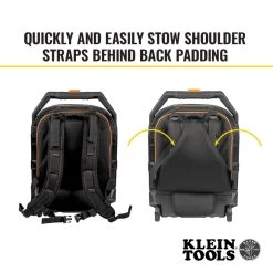 Klein Tools Tradesman Proâ„¢ Rolling Tool Backpack (Cat. No. 55604) converts easily into a rolling tool bag when carrying heavy loads. No need to worry about the terrain ahead with the 3-Inch heavy-duty wheels that can truck through unpaved paths. The rugged, telescoping handle easily extends and wraps along the backpack sides to provide extra support and stability when maneuvering around corners. Multiple interior and exterior pockets allow for maximum tool storage.